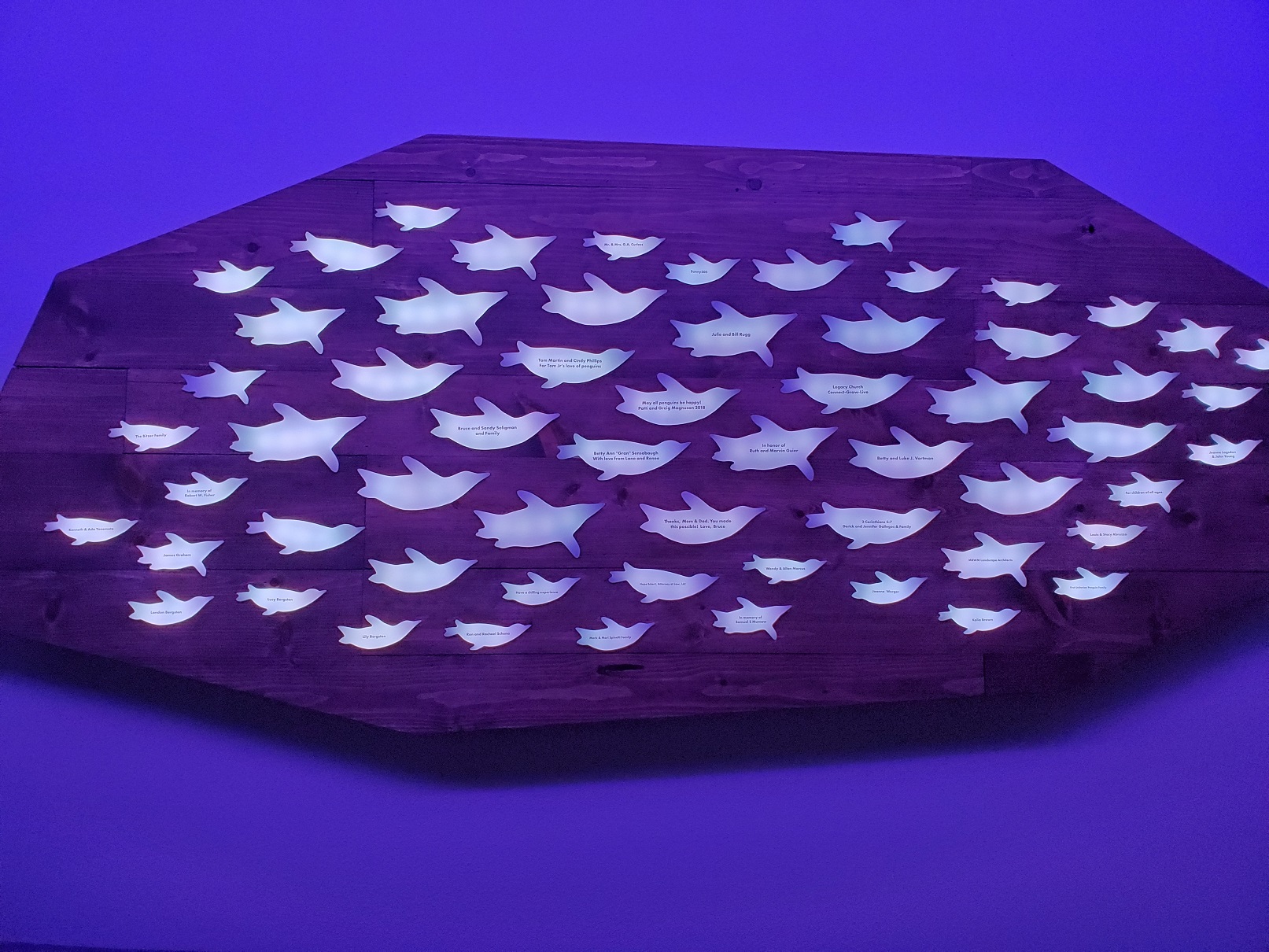 Elegant acrylic penguin silhouettes are back-lit with gently moving waves of light. Each penguin is adorned with a custom message to celebrate individuals, honor loved ones or recognize local companies. This beautiful artwork is located inside Penguin Chill and just past the first set of viewing windows. Three sizes of penguin silhouette are available. Your sponsorship will remain in place for the life of the art (estimated 8+ years).
